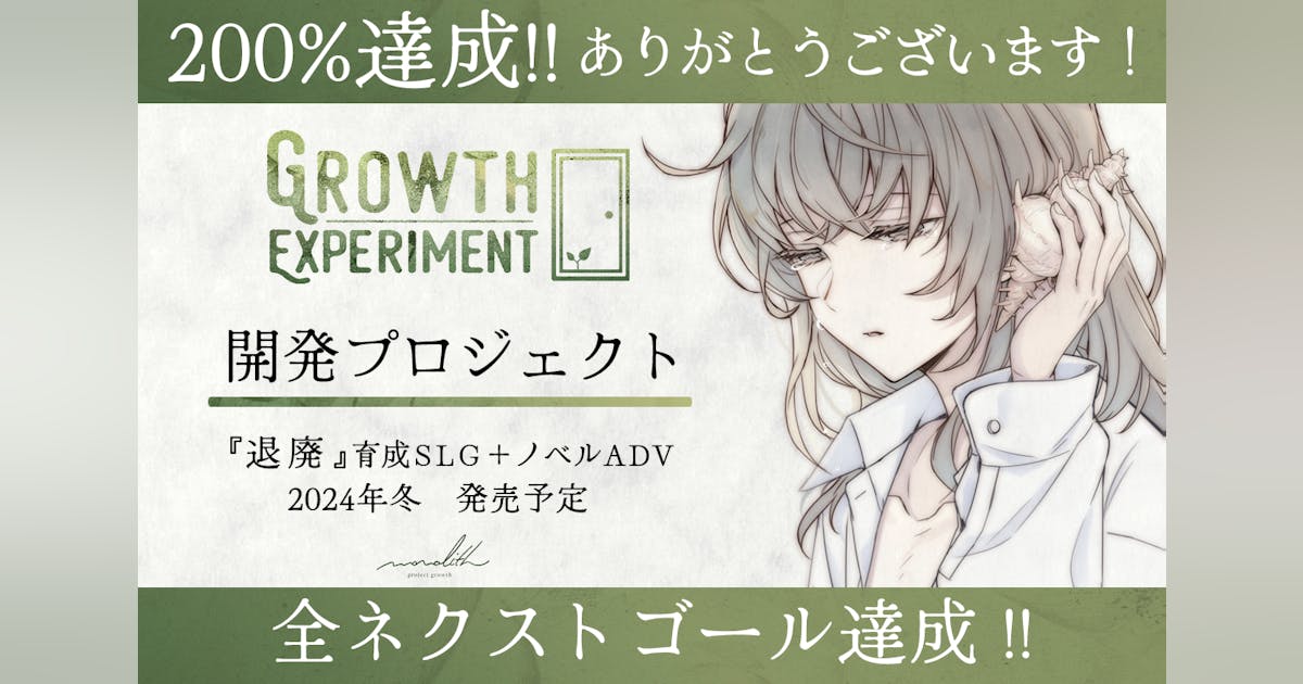 ゲーム制作チーム「monolith:project growth」は PC 向けインディーゲーム『退廃』育成 SLG+ノベル ADV「GROWTH EXPERIMENT」(グロウス エクスペリメント)の更なる品質向上のため、クラウドファンディング支援サイト CAMPFIRE にて 2023 年 12 月 20 日 19 時よりクラウドファンディングを開始しました。